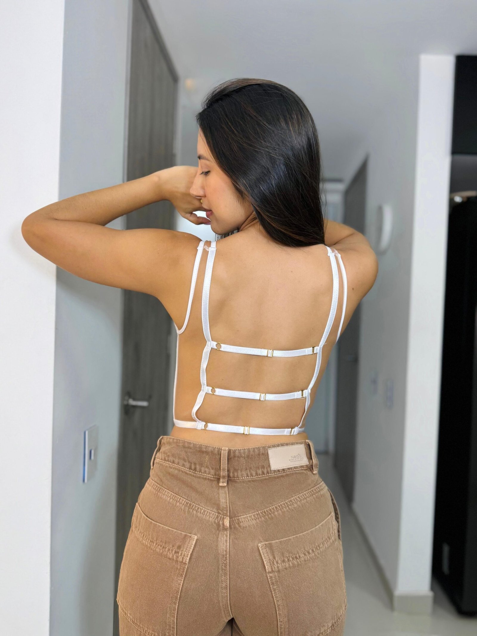 Disponible en tallas S, M y L. Corset sin copa con varillas para mejor estructura, tiras graduables y herrajes con baño en oro. Confeccionado en licra cristal y tul color piel para un acabado elegante y delicado.